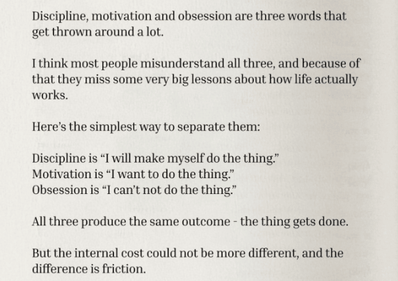 A couple weeks ago, the great podcaster Chris Williamson wrote brilliantly about how these three concepts relate to each other when it comes to getting things done. What distinguishes them, he said, is the amount of mental effort required. What he calls, “friction.” Using discipline to get something done takes the most effort. Motivation, a little less. And obsession, practically none, because you’re so consumed by whatever you’re doing, that doing it doesn’t feel like effort at all.